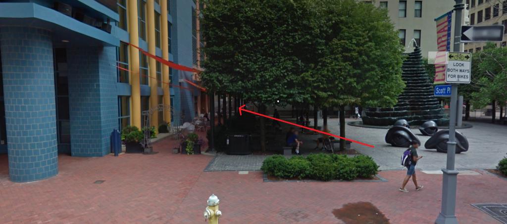 I'm not sure if I've got his direction right in my head. But could he be cutting across the plaza to continue towards 6th street rather than turning on to Scott Place? Meaning, he was planning to cross the bridge on 6th rather than 7th?
