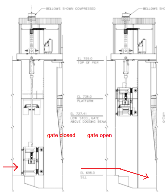 Actually, a body could quite easily flow through an Emsworth dam gate with little to no damage, especially in high flow. High river water would create a buffer of water between a body and the dam ledge. There are five 105'-long gates on the back channel dam. The gates open in an upward direction up to a maximum of forty feet. The attached image shows a side-view of a gate closed and a gate open. A body flowing through an open gate simply would drop-flow with the water.
