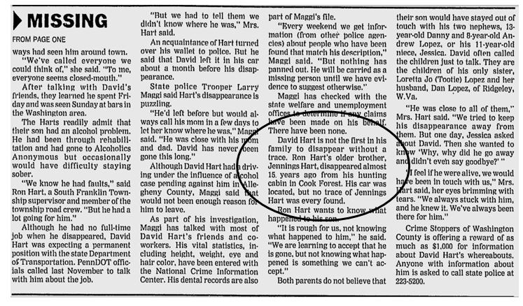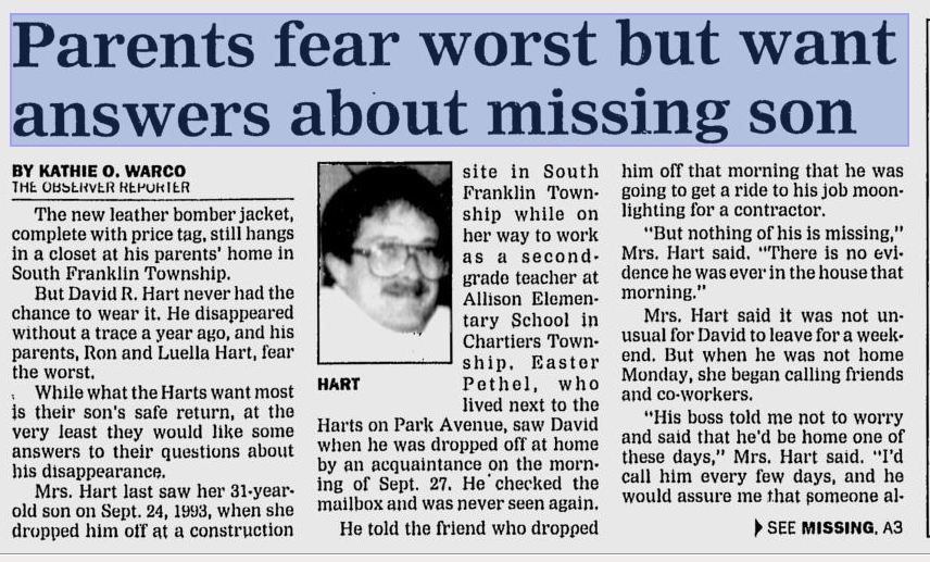 Circumstances of Disappearance On Friday, September 24, 1993, at about 7-7:30am, David Ronald Hart was dropped off by his mother at the intersection of Route 18 and Walker Lane in South Franklin Township.