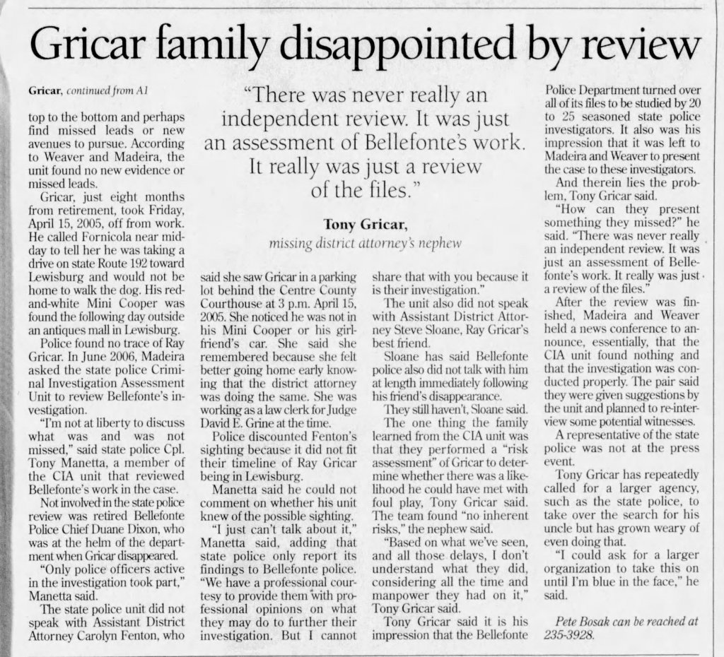 I repeatedly pressed Dixon on this question but his answers were less than satisfying. The closest I got to an answer was that Bellefonte took jurisdiction because that’s where Gricar lived.