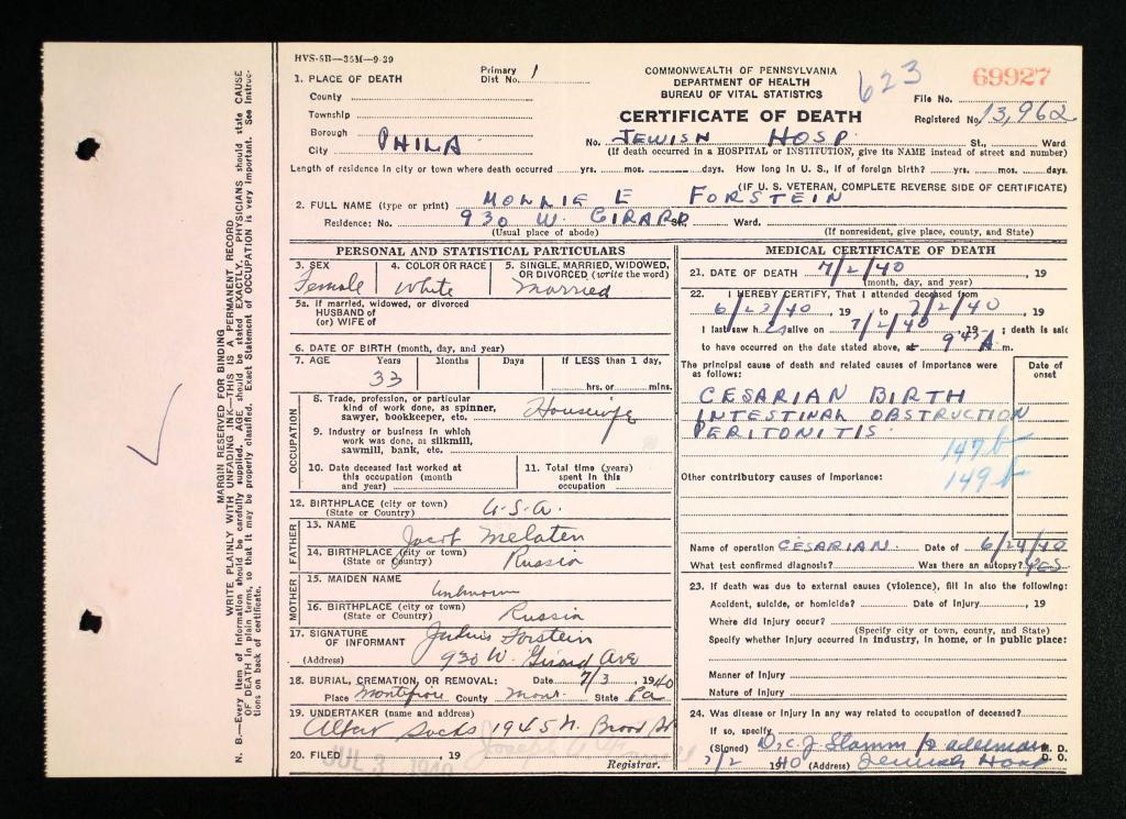 Death Certificate for Mollye/Polly Forstein - indicates infection after cesarean birth of child as the cause of death.