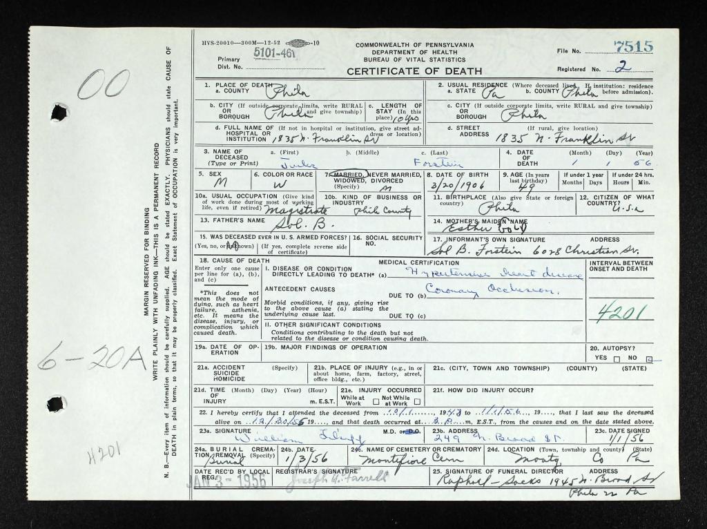 I hope this death certificate is readable - not sure what the best way to attach it is (would welcome guidance from others who have been on WS longer!). It looks like the informant for the DC was Sol. Forstein. This may be his father based on the information on Find A Grave.