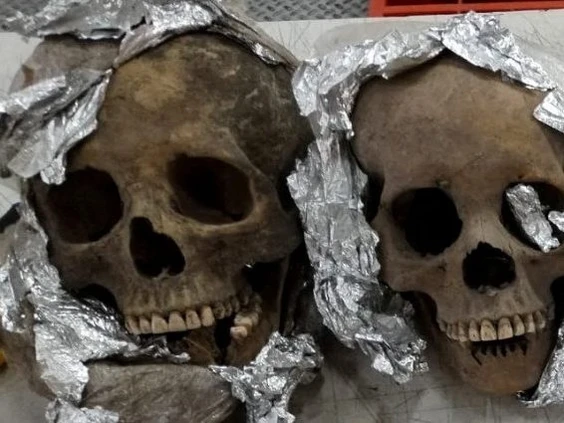 Four human skulls wrapped in plastic and aluminum foil are detected by X-ray equipment during an inspection by the National Guard inside a package bound for the United States at a courier company located at the Queretaro Intercontinental airport, in Queretaro, Mexico in this photo distributed on December 30, 2022. PHOTO BY MEXICO'S GUARDIA NACIONAL /Handout via REUTERS