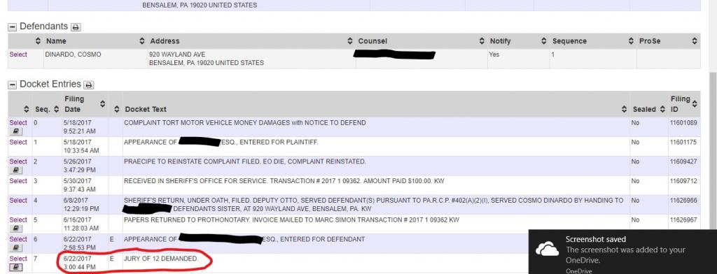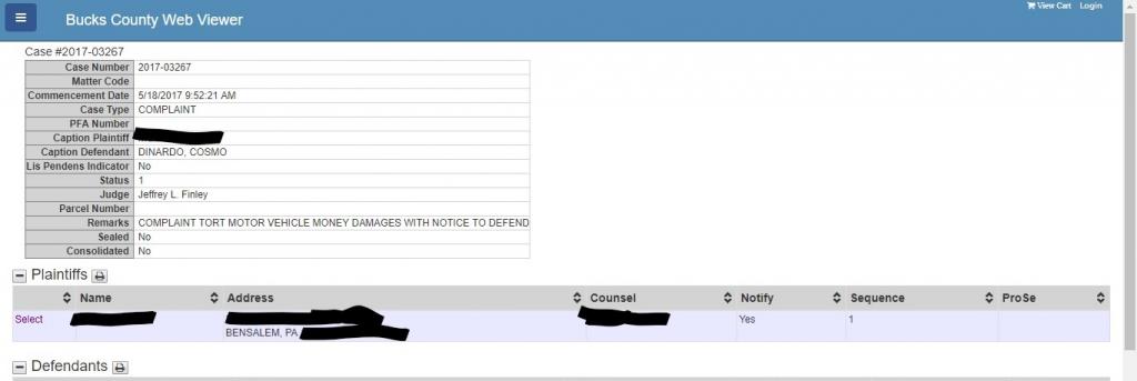 So what's weird about that last one is there IS a vehicle issue with Cosmo DiNardo as a defendant in the Bucks County Civil Court system..."commencement date" 18-May-2017...it says "COMPLAINT TORT MOTOR VEHICLE MONEY DAMAGES WITH NOTICE TO DEFEND" and the last entry from 22-Jun-2017 says "Jury of 12 demanded."