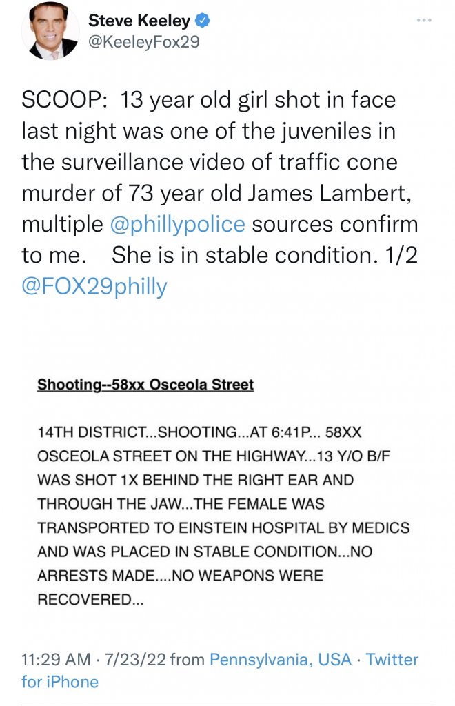 “SCOOP: 13 year old girl shot in face last night was one of the juveniles in the surveillance video of traffic cone murder of 73 year old James Lambert, multiple @phillypolice sources confirm to me. She is in stable condition. 1/2 @FOX29philly”