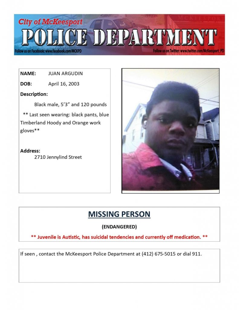 Anyone who sees the teen or knows his whereabouts is asked to call 911, or call McKeesport police at 412-675-5015.