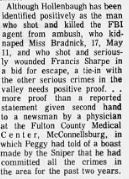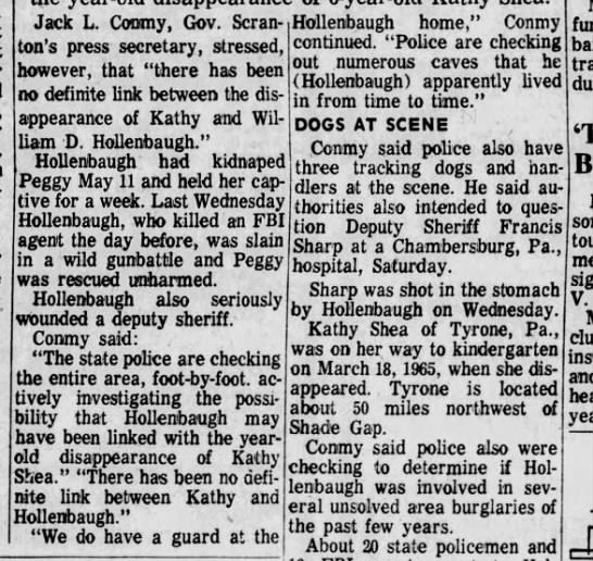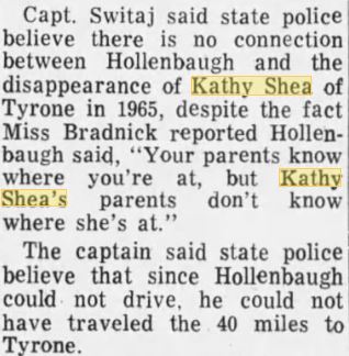 His making it to Tyrone (30 miles) via bicycle and rails is possible, though I highly doubt it. He moved to the area around 1962, and he was committing crimes in the area up until P.A.B's abduction in 1966. Most of these crimes involved "peeping Tom" type incidents involving grown women, or larceny. Shortly after Kathy's disappearance (less than a month) Hollenbaugh was linked to a shooting of a local man who approached a trespasser on his property at night. The shooter was thought to have been spying on the man's wife at the time. I've never heard stories of him ever harassing little girls or eyeing them, etc. Kathy's case doesn't fit his M.O. as far as I can see. All of his crimes also involved firearms (long guns), which had someone (around the time of Kathy's disappearance) seen a man traveling the rails or a bicycle with a long gun, I'm sure it would have been mentioned to L.E.O's. Peggy was 17 when this happened, and not little and defenseless.