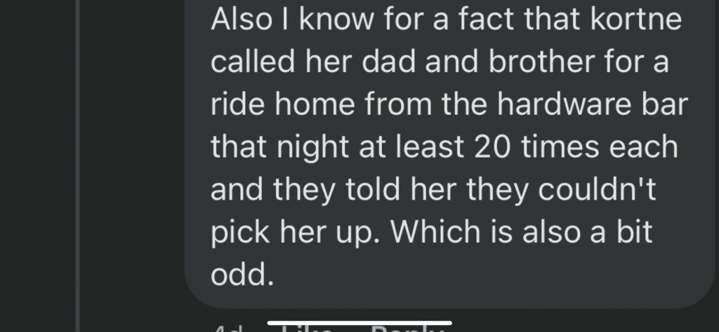 Kortne is attacked by Cody around 4:10 am and he has her subdued by 4:31. Cody is then seen around sheetz at 7:56. They had 3 hours to get together and plan, get her out of the house, get her to the lake, and find a spot to bury her. Unless they had something in mind already, this would all be "off the cuff" thinking. If Cody made an advancement and Kortne rejected him resulting in an attack, they wouldn't have plans prepared. They also would need additional time for digging and getting cleaned up. 3 hours to find a spot to dump a body or to dig one yourself.