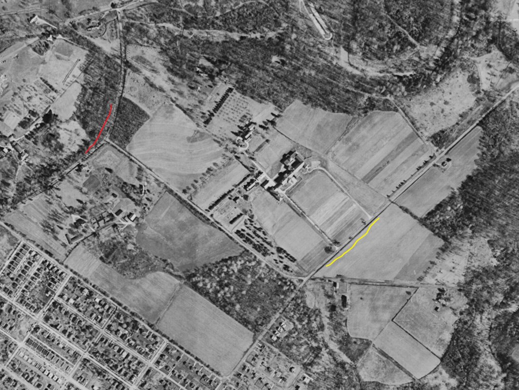 Here's an aerial photo of the site taken in 1959. Veree road is marked w/ the Yellow line. Pine in Red. The road between is Susquehanna Road. I believe one of the well footpaths mentioned above is in the woods that extend 10-15 feet into the field. Not sure about the intersection they mention.