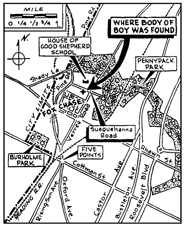 In 1957, Susquehanna Road was a narrow country lane in the sparsely settled Fox Chase section of northeast Philadelphia. It was approximately a half-mile in length, linking Pine Road on the west with Verree Road on the east. The southern side of Susquehanna Road was wooded at that time, but the tree cover did not extend beyond a few yards from the road in most places. It quickly gave way to extensive stretches of open field and scrub growth. This provided a perfect habitat for rabbits, muskrats, and other small game. There were no houses on Susquehanna Road itself, but the compound of the Sisters of the Good Shepherd, a religious order which operated a school for "wayward girls", adjoined the road on the north. A driveway providing access to this large, multiple building facility was located about 500 yards west of the intersection of Susquehanna and Verree roads. Almost directly across the street from the entrance to the Good Shepherd School was a wooded area choked with thick underbrush that was often used by local residents as a place to dump refuse. It was here, at the junction of two well-worn footpaths, that the victim's body was twice discovered during the final week of February 1957.