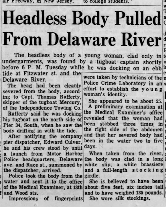 Circumstances of RecoveryBody found decapitated and floating in Delaware River by Harbor Patrol