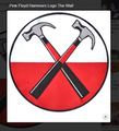 Black and red tattoo of circle with two hammers on left lateral shoulder