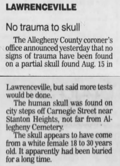 Case History: skull found located in a metal box on Celadine Street, Pgh 15201.