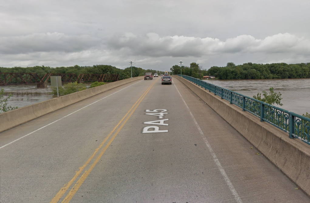 There is no designated pedestrian walkway on the bridge. There is a marked shoulder on both sides. The down river side has a railing on it. the up river side does not.