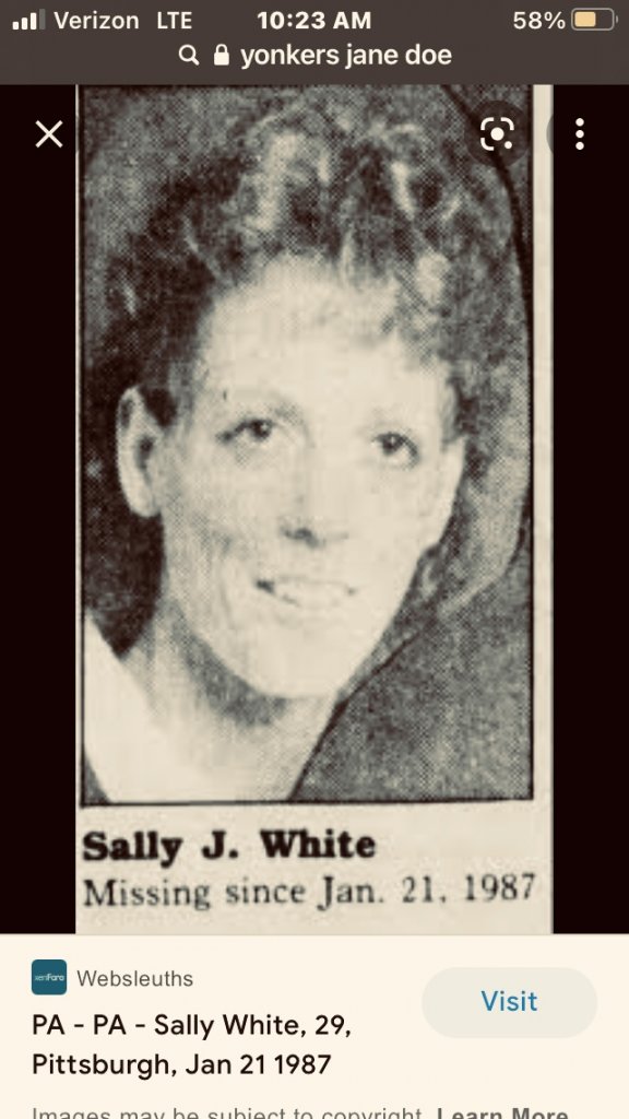 Sally J. White, missing since 1987 from Pittsburgh, Pennsylvania. She had left her apartment in a hurry on January 21, leaving behind her two young sons and all of her posessions. Her husband had been killed in a car accident a few years prior, and her behavior had since become very withdrawn and depressed. Please, if anyone knows any information on her, such as her husband's first name or her maiden name, please let me know!​