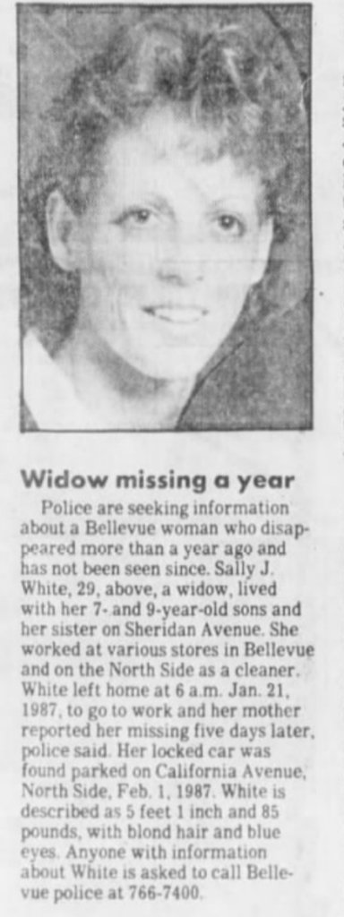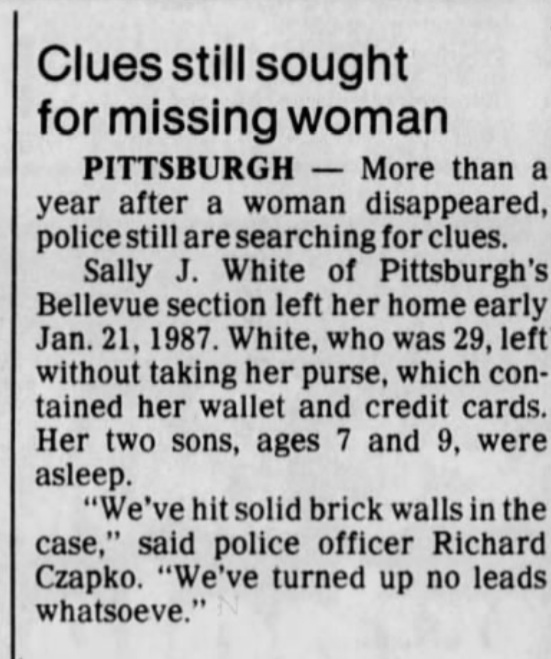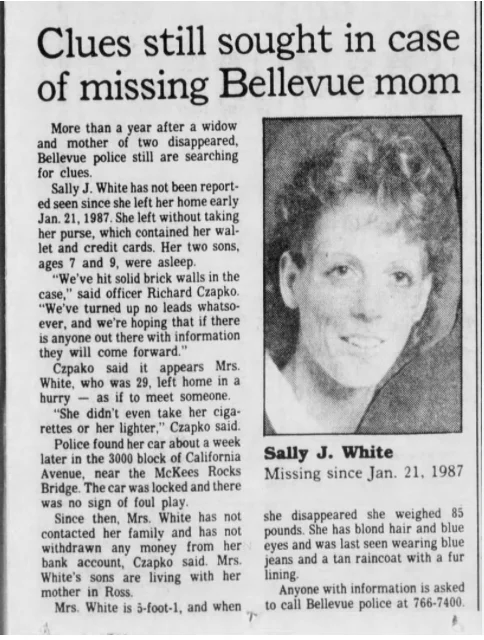 White was last seen in Pittsburgh, Pennsylvania on January 21, 1987. She lived with her two sons in a first-floor duplex in the 60 block of Sheridan Avenue in Bellevue, Pennsylvania. She apparently left home sometime before 6:00 a.m., without taking her wallet, purse, credit cards, cigarette or lighter, leaving her two young sons asleep.