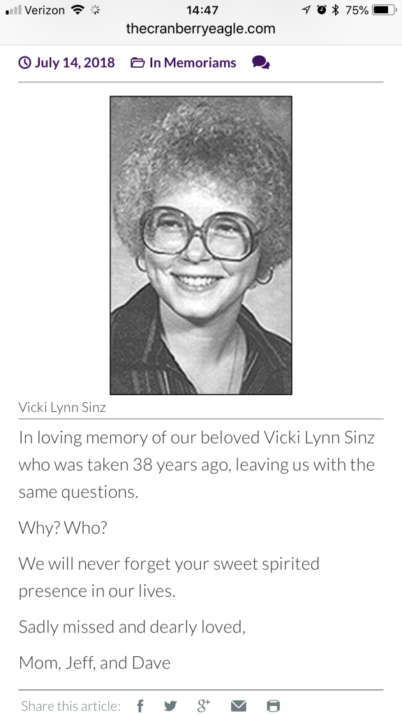 On July, 15, 1981, at approximately 3:00 a.m., Vicki Sinz was last seen walking north on SR 8 from the Rusty Nail Pub in Butler Township, Butler County, near the Picklegate Bridge. Her body was discovered approximately ten days later in a culvert running under Brook Devore Road in Summit Township, Butler County, Pennsylvania.