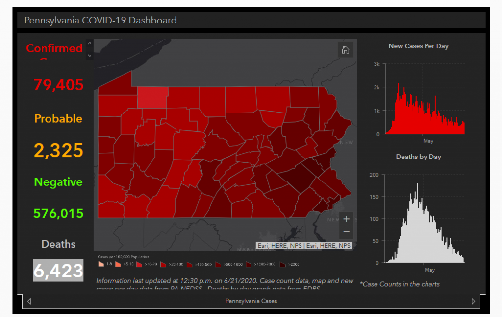 The latest numbers were reported by the state Health Department just as 24 counties eased some of the restrictions that Gov. Tom Wolf put into place about two weeks after the virus surfaced here. In those counties, mostly in northern and central Pennsylvania where populations are comparatively low, stay-at-home orders were lifted Friday and retail stores were allowed to open. But people there are still told to practice social distancing and wear masks, and restaurant dining rooms remain closed.