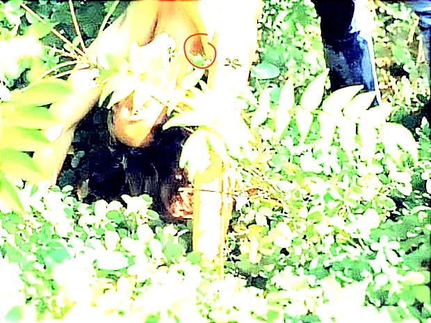 Furthermore, there's a lot going around the head. Beside some sort of strings, there's this discrepancy re the hair. Not sure if this is blurring done by LE or indicative of something poured on the hair. Could also unfortunately be blood.