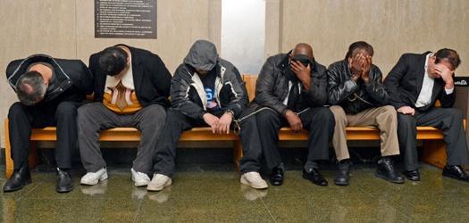 (l-r) Sokol Perkaj, Ausama Ahmad, David Lombardo, Theo Jones, Qabari Gaber and Assaaf Nahomove sit shackled in a Manhattan court yesterday Photo: Steven Hirsch
