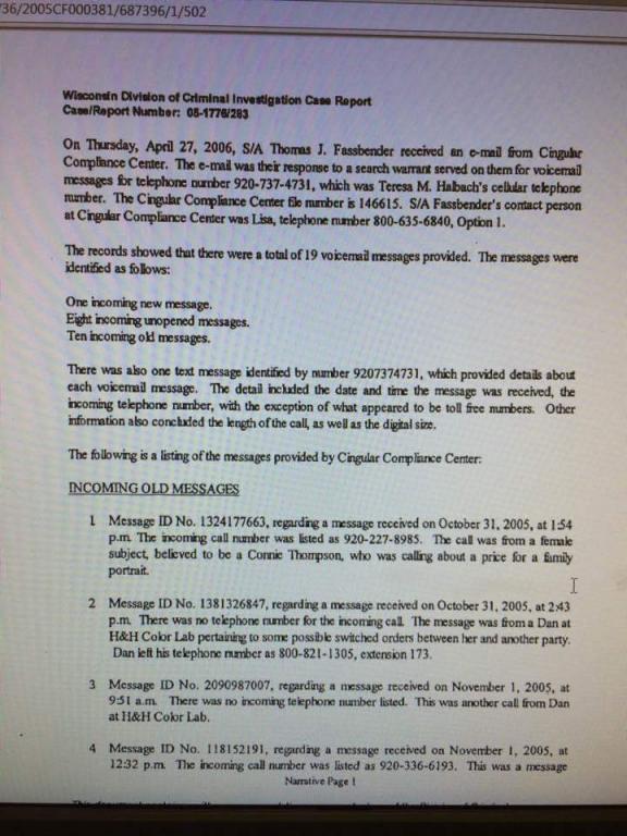 "There was also one text message identified by number (TH's phone number), which provided details about each voicemail message. The detail included the date and time the message was received, the incoming telephone number with the exception of what appeared to be toll free numbers. Other information also concluded (sic) the length of the call, as well as the digital size.