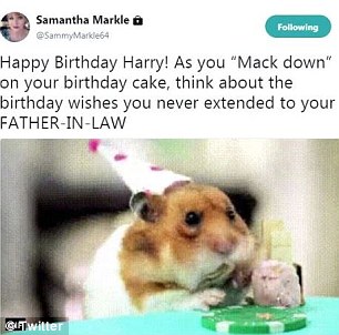 'Happy Birthday Harry! As you "Mack down" on your birthday cake, think about the birthday wishes you never extended to your FATHER-IN-LAW,' she posted on Twitter.