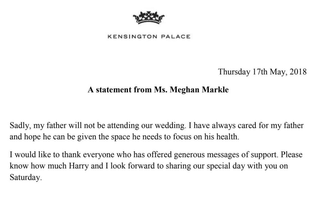 Official statement from Meghan / Kensington Palace - her dad is not going to be there