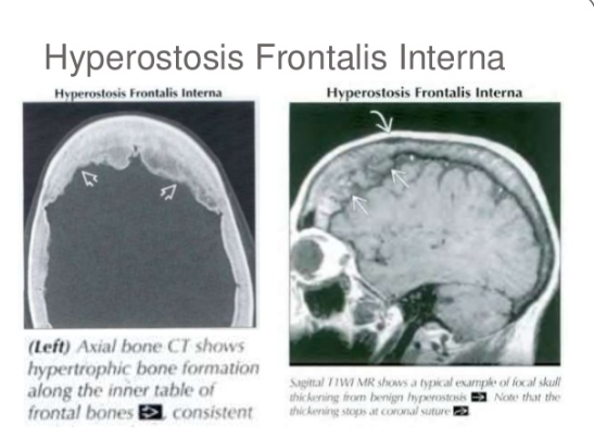 2. Hyperostosis frontalis interna is an inherited pathological condition which is characterized by thickening of the frontal bone of the skull. This condition is believed to be seen mostly in females. Hyperostosis Frontalis Interna is found to be associated with many different conditions like seizure disorder, migraine headaches, obesity, diabetes insipidus, excessive hair growth, and abnormality in the function of the sex glands.
