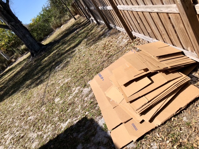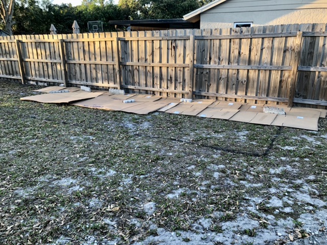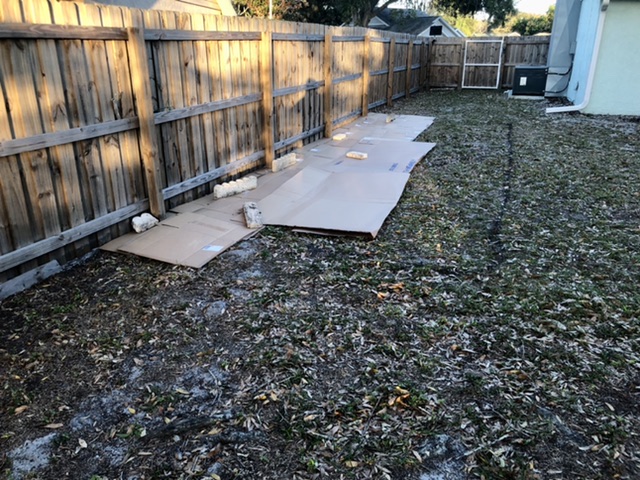 I have a bunch of the old concrete edging pieces and stepping stones. My plan is to start leveling out the area, then put the landscape fabric down, place the old edging pieces to hold it down. I will place them away from the fence so I can walk all the way around them. I'll put the 6' one in the middle so I have a gap between the ends of them, if that makes sense.