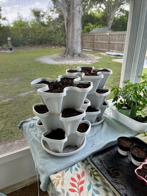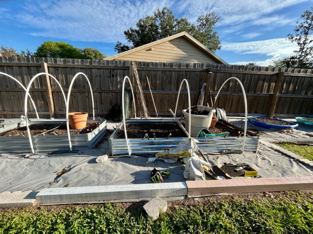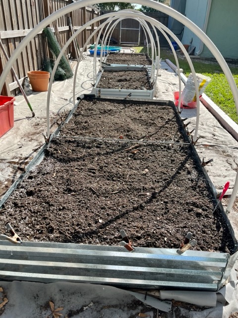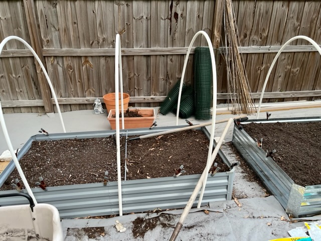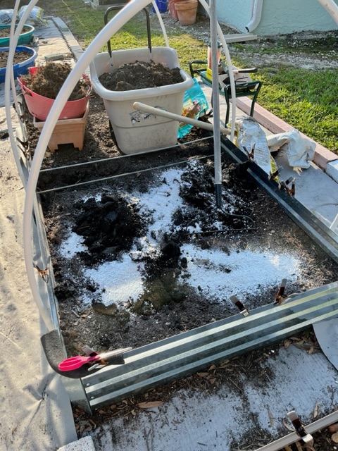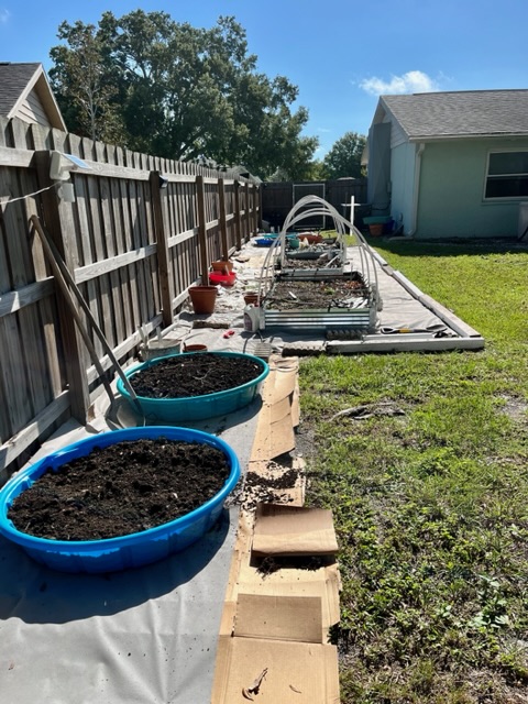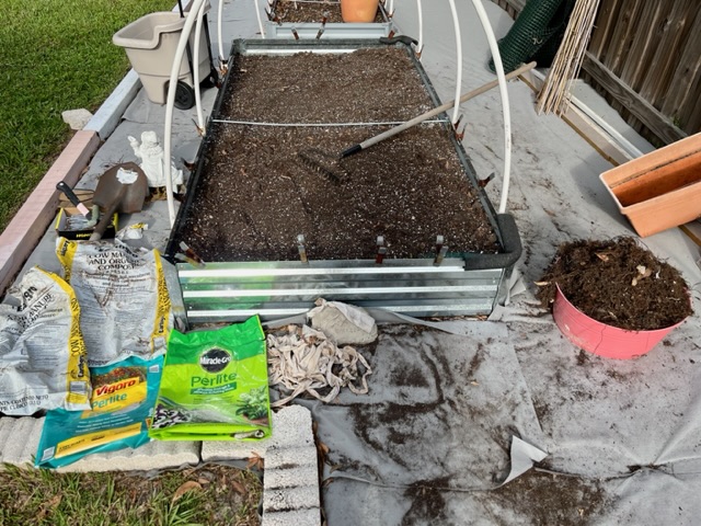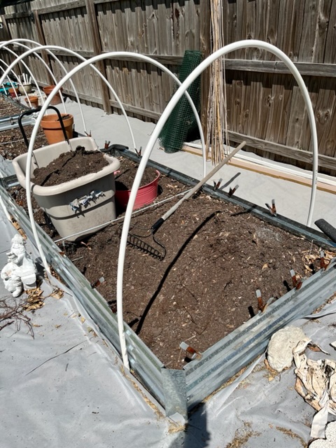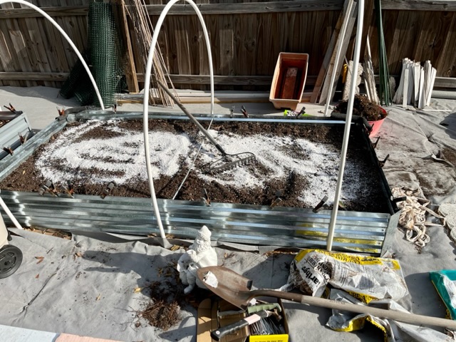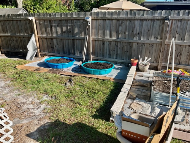 I am at the point where I can work on prepping the beds. The kiddie pool area is all raked out. I have 16 bags of compost and 4 bags of perlite to add into the beds, kiddie pools and individual pots.