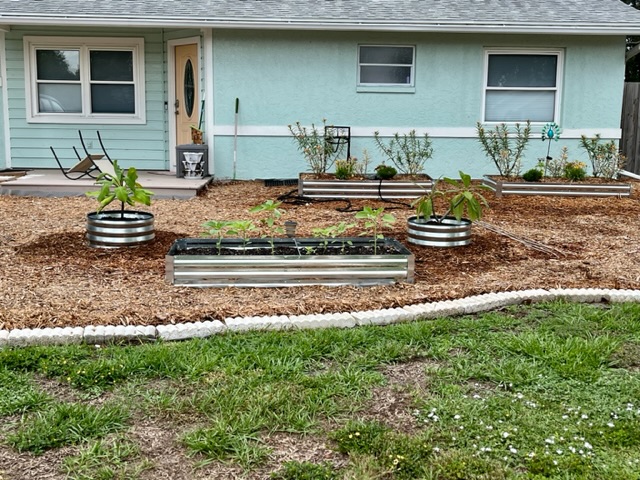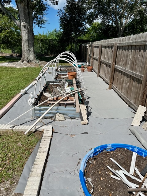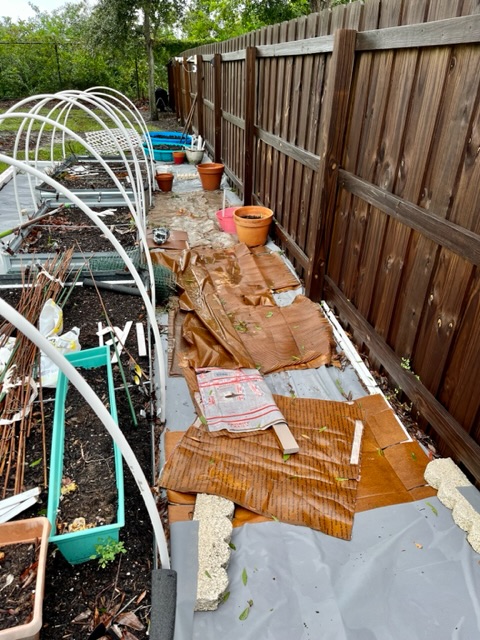 Been working in the garden putting down new "flooring" to walk on. The old landscape fabric was deteriorating from the sun. I finished the cardboard and another layer of fabric. If mulch goes on sale, I may put a thin layer over it to protect the fabric from the sun.