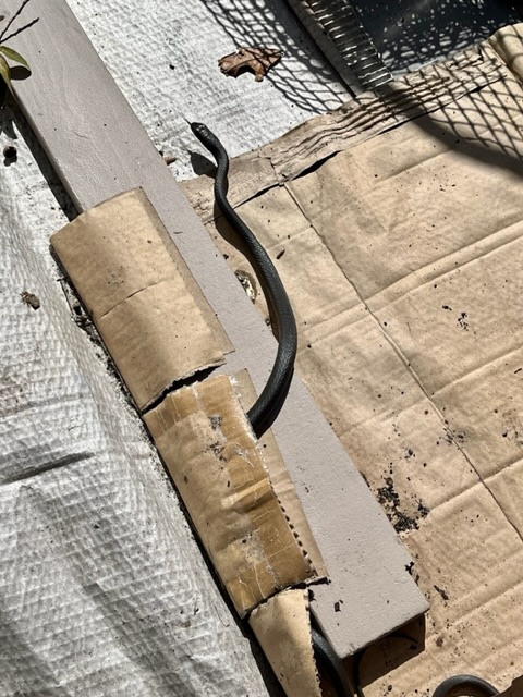 I had a harmless black 3' slithery visitor today. He slithered away under the roll of garden mesh. I was digging up the area where the kiddie pool was and noticed what looked like a 4" baby. Definitely not a worm, they tend to be brown/red. The wetlands behind me probably has a lot of food sources for them.