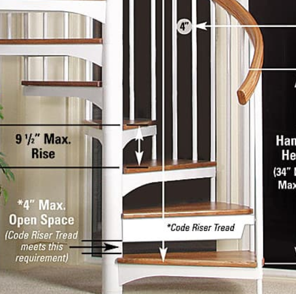 The third image is a modern depiction of building code spacing of spiral staircases showing the spacing between steps. Not knowing the specifics of the Ramsey spiral staircase, it looks to be common and building codes need to be followed...consequently, it is pretty safe to assume that the stair spacing on those stairs is at least 8-9 inches, allowing for leeway.
