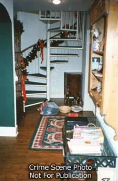 The first image is from the CBS reenactment of the crime scene that shows the location of the papers on the stairs as Patsy described.