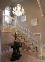 I'm interpreting this as he fell from the landing. That chandelier plays a part somehow. I wonder if he jumped and grabbed hold of it. A neighbor said it fell on him. The picture is old, from before JS bought the mansion. Don't know if he bought it furnished, but if that table is still there, he might've hit his head on a sharp corner.