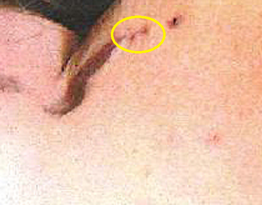 Ok, so, I think Cynic has cropped the photo as it’s quite disturbing as it include the back of the neck and just above the ‘mark’ quite a deep furrow ( the indentation of the rope) in the left side of the neck.