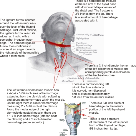 The location of the ligature furrow on the front of the neck is illustrated below.