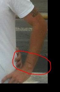 So he does have tats on both wrists. I remember seeing the vid of him in the helicopter and that's the right wrist. If he was seated in the driver's seat and the seller on his right, this is the wrist he would have noticed more easily. The photo Arnie posted of his hand on his hip has a square shape around the word on his left wrist. I didn't think of looking for a square shape at all. I was thinking a rectangular shape would fit more tightly around the word. This looks like it to me. It is faint but I see a square.