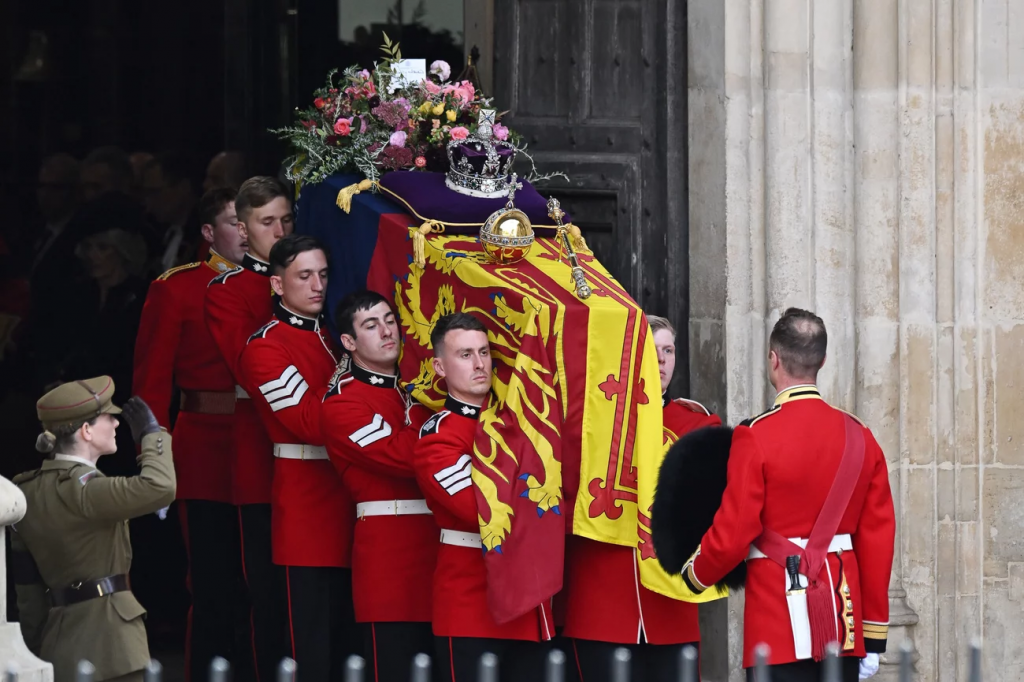 The Bearer Party of The Queen's Company, 1st Battalion Grenadier Guards carries the coffin of Queen Elizabeth II, draped in a Royal Standard and adorned with the Imperial State Crown and the Sovereign's orb and sceptre from the Abbey at the State Funeral Service for Britain's Queen Elizabeth II at Westminster Abbey on Monday.![]()