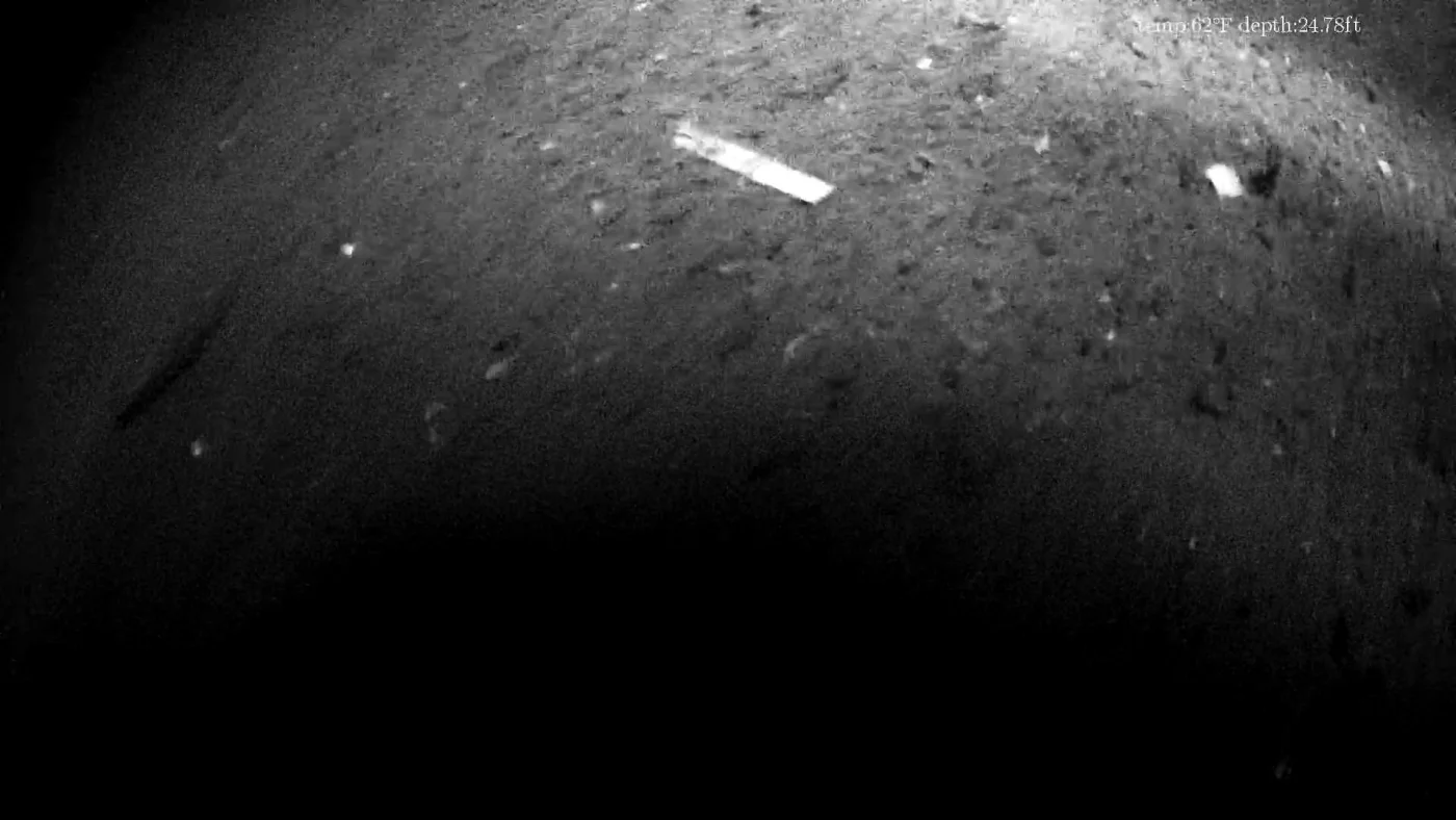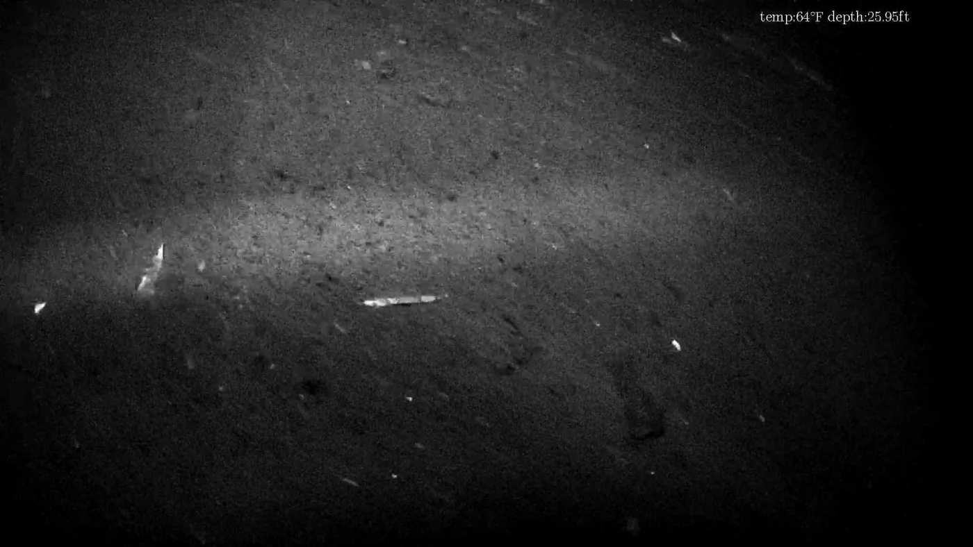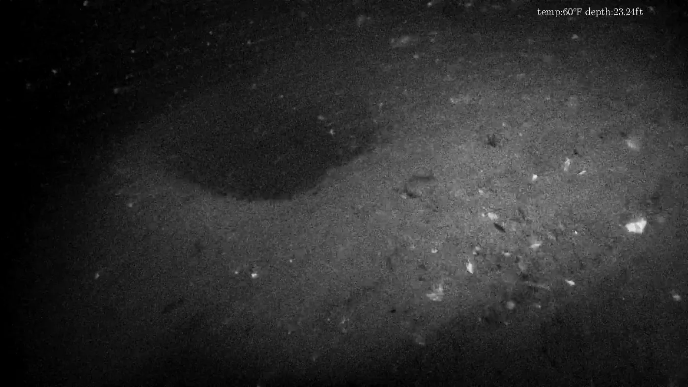 I will be back out on the water tomorrow morning during high tide, least amount of current, to start getting a visual look at the bottom of the hole with an underwater camera rig that has a IR lighting and camera sensor for low light and tannic conditions. When I was at the boat ramp checking the water clarity with this system, a large turtle swam by. I was able to capture a glimpse as the turtle passed by. The water is very tannic so I used the IR lighting which produces a black and whit image.