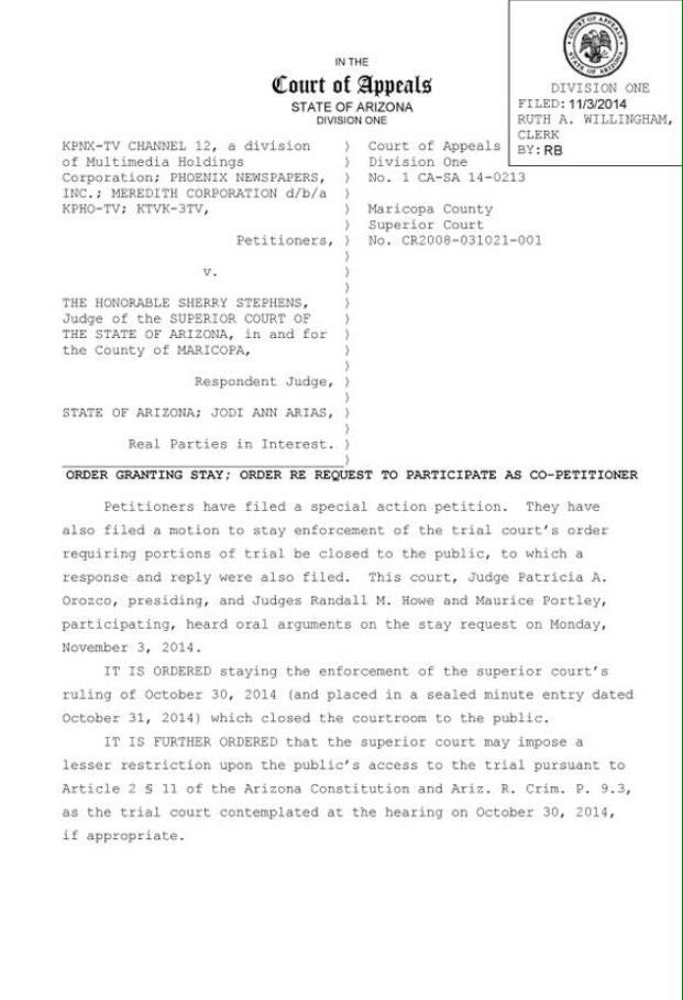 Appellate court heard argument in public (imagine such a thing lol) at 11 am IIRC. Secret trial was suspended because Nurmi and JM needed to go to the Ct App for that argument. Secret trial may have resumed at 1:15 pm. Ruling from Ct App came down at 3 pm staying enforcement of the order closing the courtroom. The merits of the special action are scheduled for consideration Nov. 25.