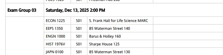 According to the Brown bulletin that's a group project-based class for engineering upperclassmen and graduate students. I can't tell if it's supposed to be a capstone project. My first question was -- could he have been somehow aggrieved with his groupmates? But I think he would have been identified by now if that was the case.I apologize if someone has already pointed this out, but while I was searching whether review sessions were publicly available, I did find a listing of final exams for the semester. There were final exams scheduled on a Saturday, and there was one scheduled in the Barus & Holley building in Room 160. The shooting took place in Room 166.