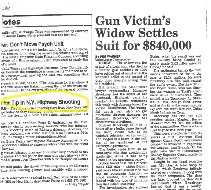 - On February 5, 1997 at about 6:00 p.m. on the eastbound side of I-84, about 1/5 of a mile west of exit 12 (about 4 miles east of the Newburgh-Beacon Bridge eastbound toll barrier) in Dutchess County, NY. Aderson apparently was involved in an accident with the suspect's vehicle, from which an argument ensued and Aderson was shot in the chest.