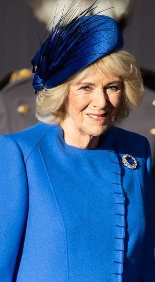 For the formal arrival, HM Camilla wore the Prince Albert Sapphire Brooch.