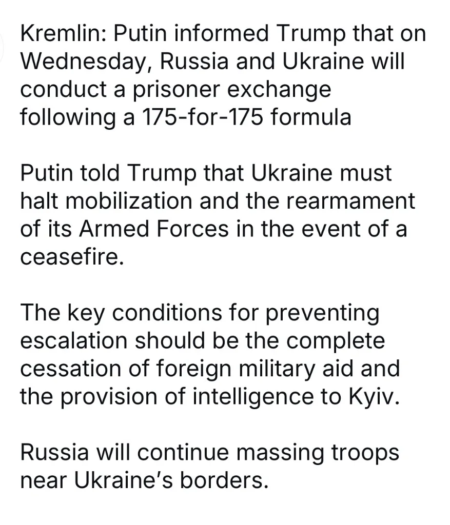 The statement also says that Putin informed Trump of plans for a Russian-Ukrainian swap of 175 prisoners of war on each side, and “as a gesture of goodwill” a further release of 23 “seriously wounded” Ukrainian servicemen.