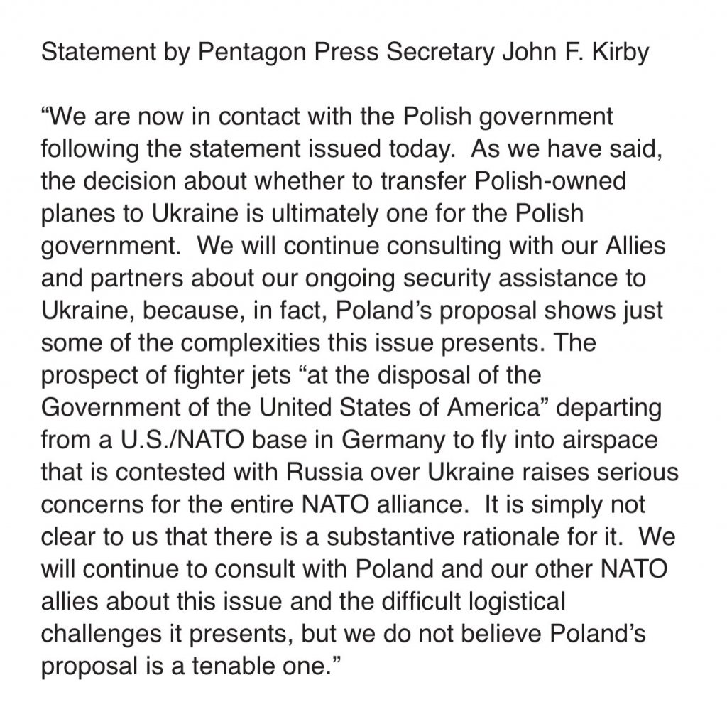 - Pentagon response to Poland's proposal on jets: "We will continue to consult with Poland and our other NATO allies about this issue and the difficult logistical challenges it presents, but we do not believe Poland’s proposal is a tenable one.”
