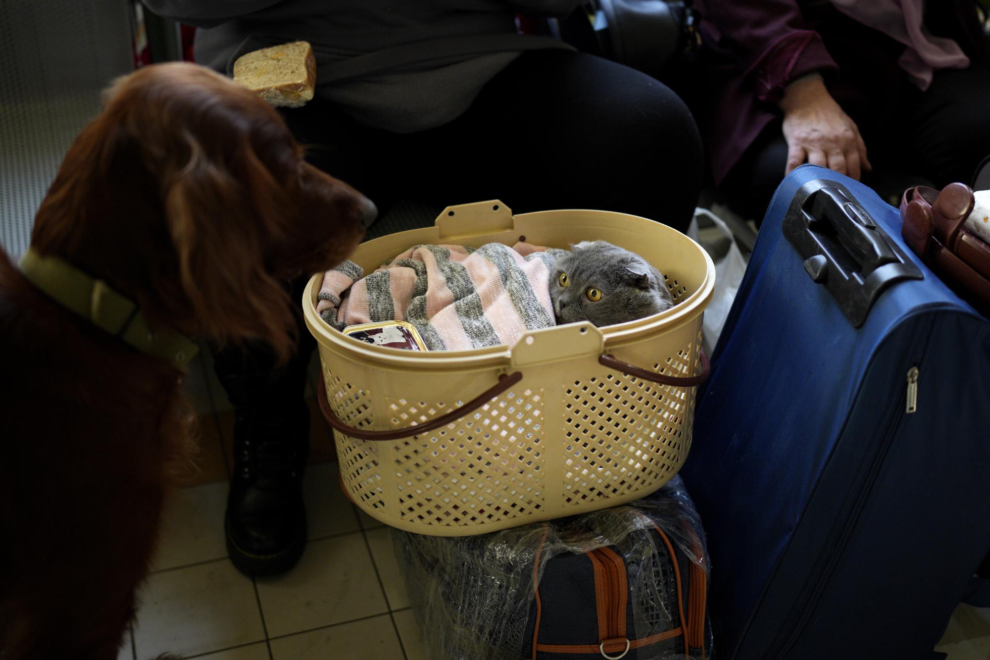 Refugees that fled the war in Ukraine, with their pets and belongings wait at the Przemysl train station, southeastern Poland, on Saturday, March 12, 2022. (AP Photo/Daniel Cole)