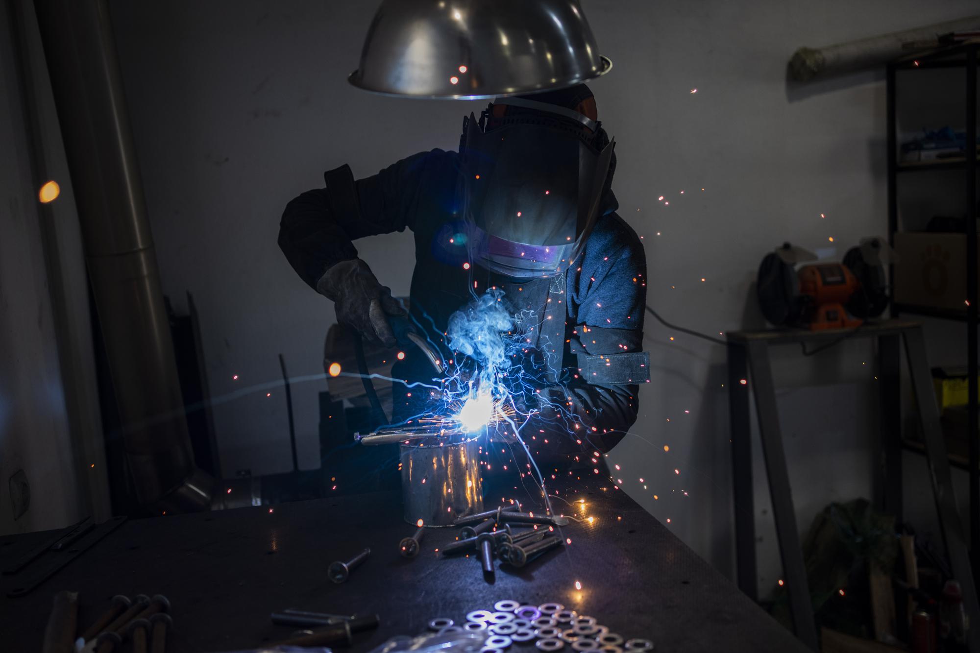 A Ukrainian welder builds a tire deflation stringer spike system in Lviv, western Ukraine, March 12, 2022. (AP Photo/Bernat Armangue)