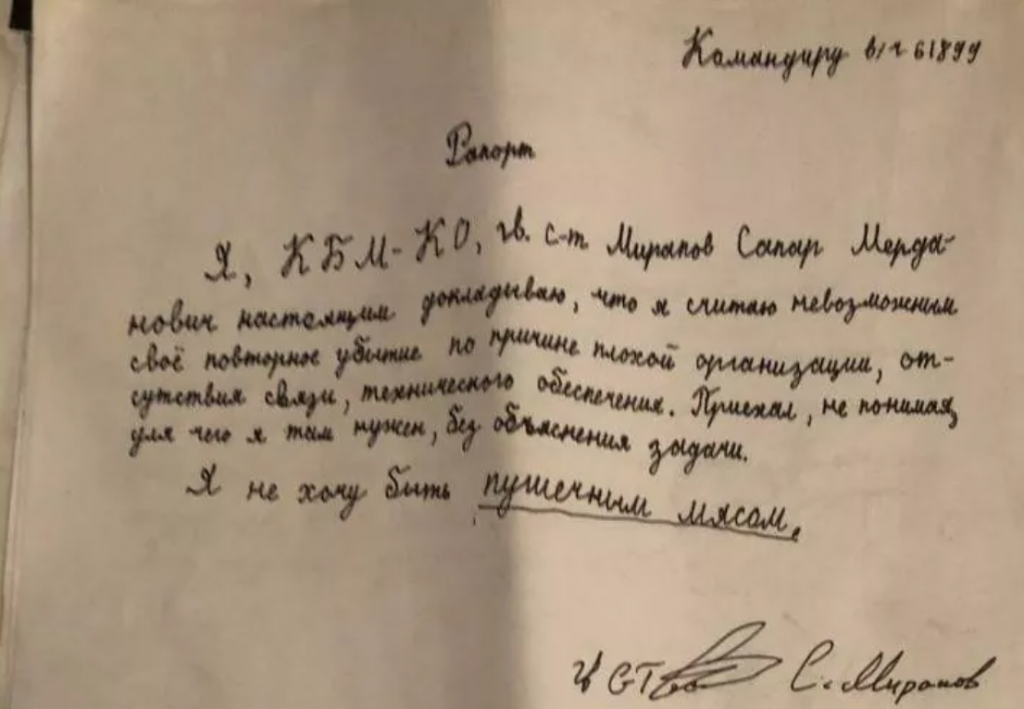 Sergeant Sapar M. Mirapov wrote in his personal statement to the commander of the Military Unit #61899: “… I hereby report that I consider it impossible to re-deploy due to the unit’s poor organization, lack of communications and technical means. [On my original tour], I arrived without understanding why I was needed there, without any explanations of the task. I don’t want to be ‘cannon fodder.’”
