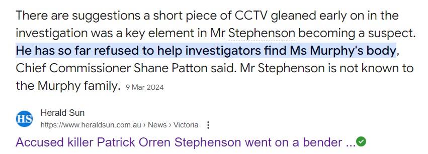 Exactly. The police could not possibly be certain of that. IMO that repeated comment from Vicpol was made for a strategic reason.